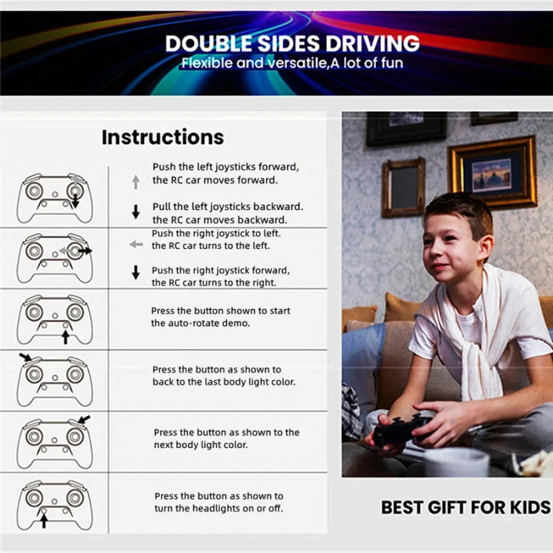 Made with high-quality ABS material, the body of this RC car is built to withstand crashes and rough play. Whether your child is racing indoors or outdoors, the durable construction ensures long-lasting fun while keeping the car intact through all the stunts and flips.