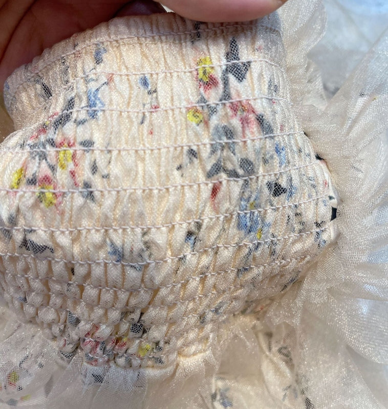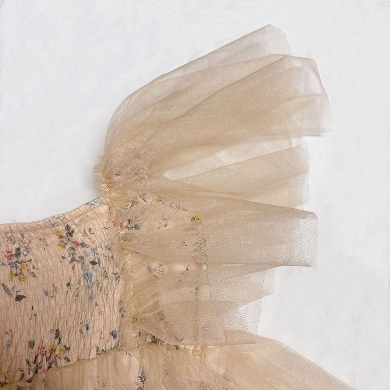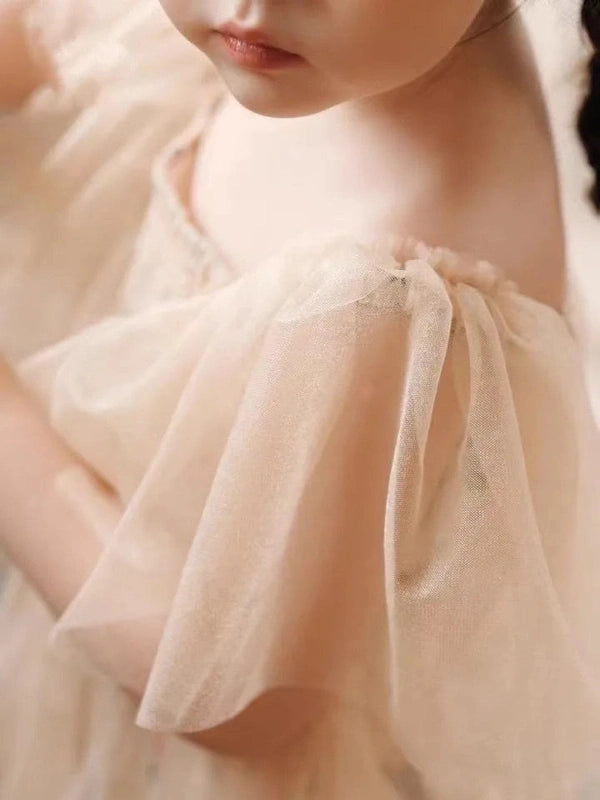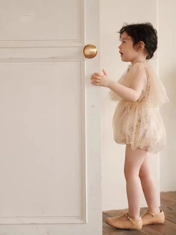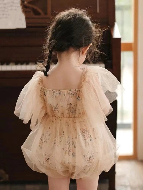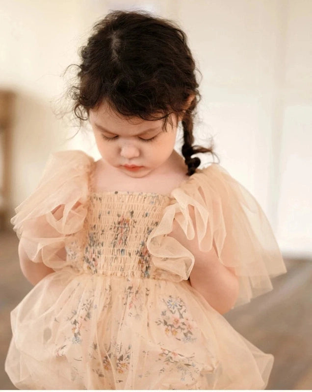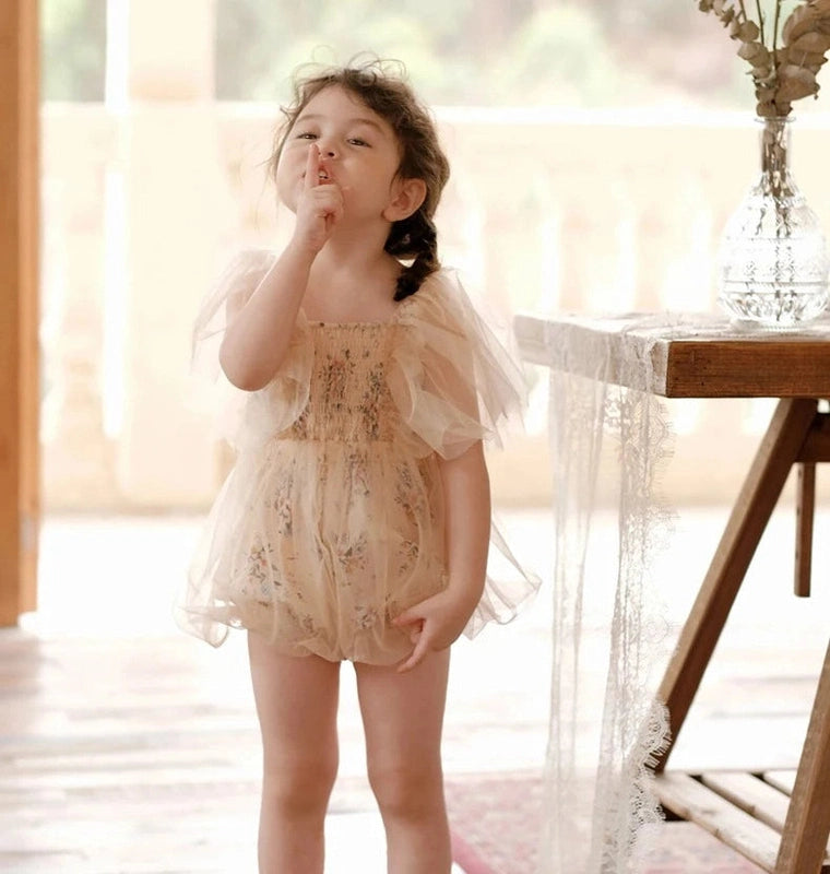 The delicate floral accents and pleated mesh give this romper a regal, princess-like charm. The timeless beige color complements any occasion, making it the perfect choice for birthdays, christenings, or photoshoots.