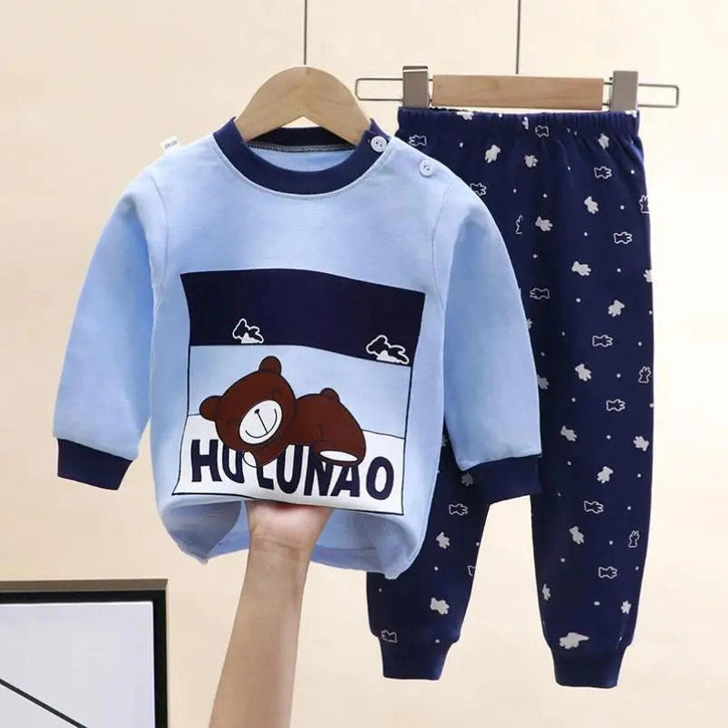 This adorable 2-piece pajama set is designed to keep your little one cozy and stylish all season long. Featuring a playful cartoon bear design and made from a soft cotton-polyester blend, this set is perfect for home wear or bedtime during autumn.