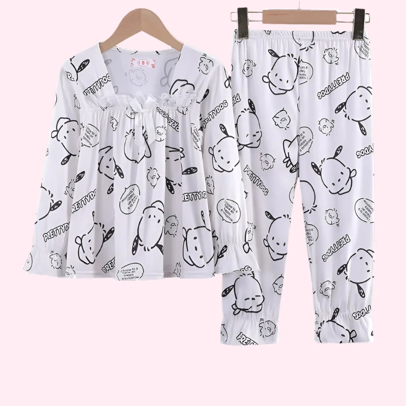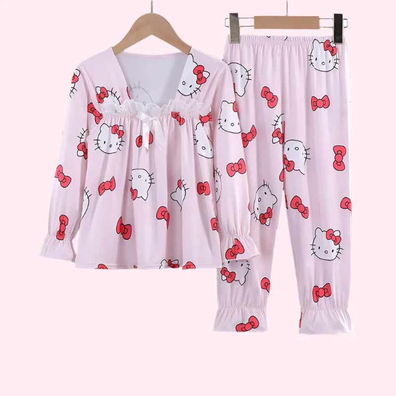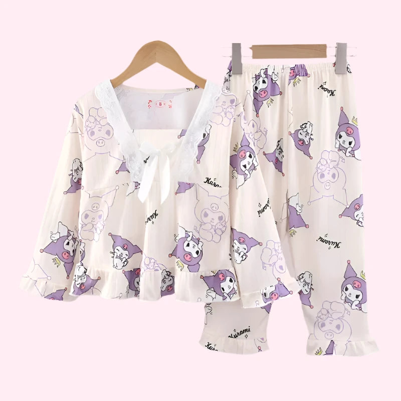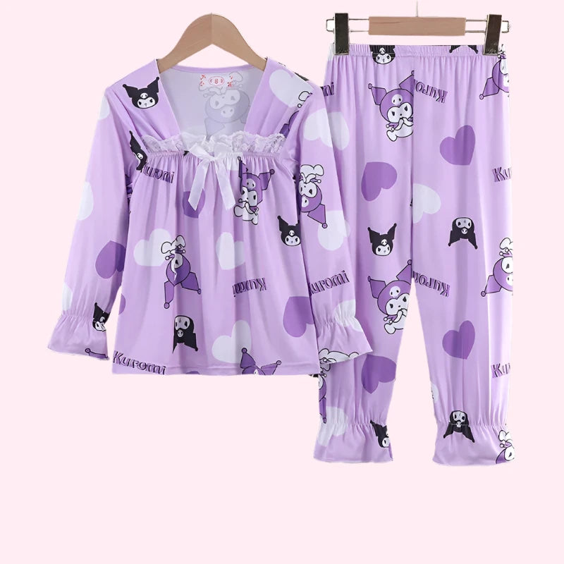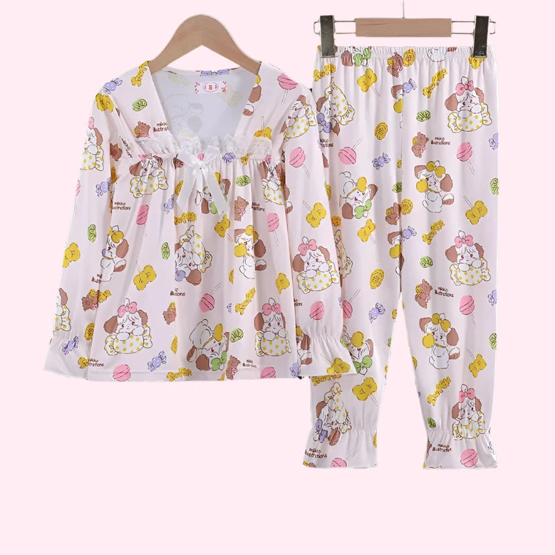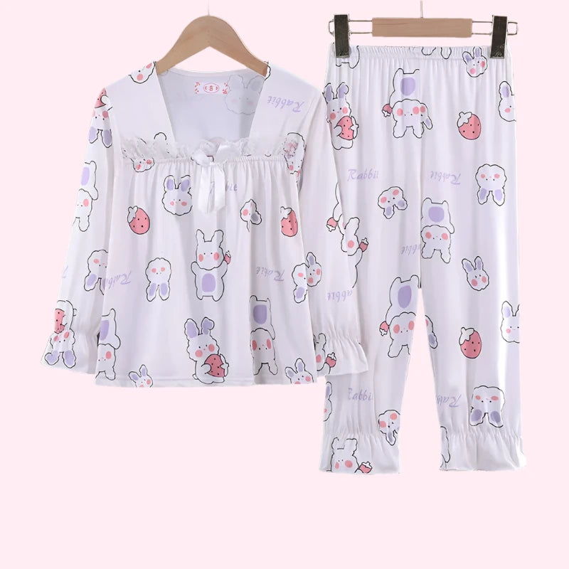 Featuring a square collar and charming bow lace decoration, this pajama set blends style and comfort. The cartoon print adds a playful touch, making it a favorite for your child, while keeping them warm and looking adorable.
