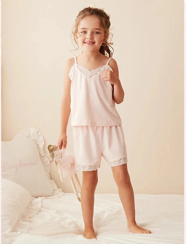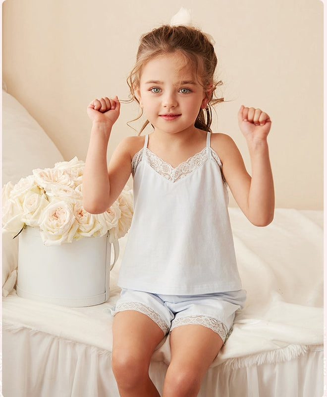 The intricate lace accents on the camisole top and shorts add a touch of elegance to this pajama set, creating a stylish and sophisticated look that your little girl will love. Perfect for sleepovers or lounging at home in style.
