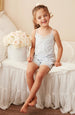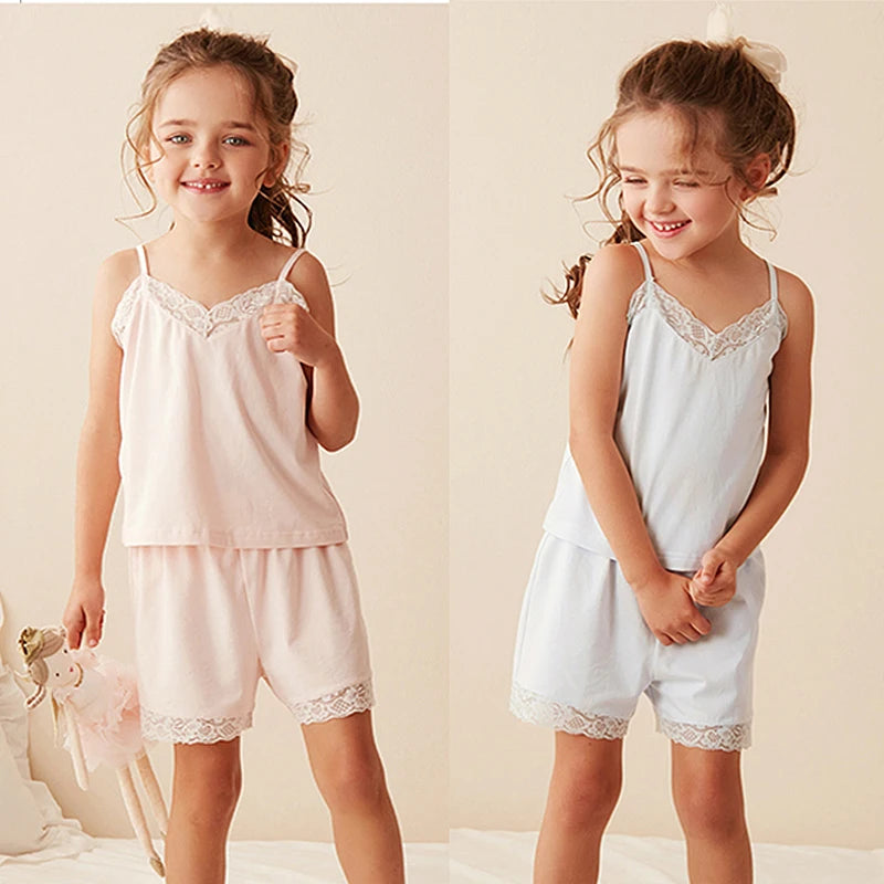 This adorable sleeveless pajama set combines a lightweight camisole top and matching shorts, adorned with delicate lace details for an elegant yet playful touch. Perfect for toddlers and young girls, this set is crafted from soft cotton to ensure comfort and breathability. Available in blue and pink, it’s the ideal choice for warm nights, relaxing mornings, or casual playtime.