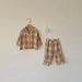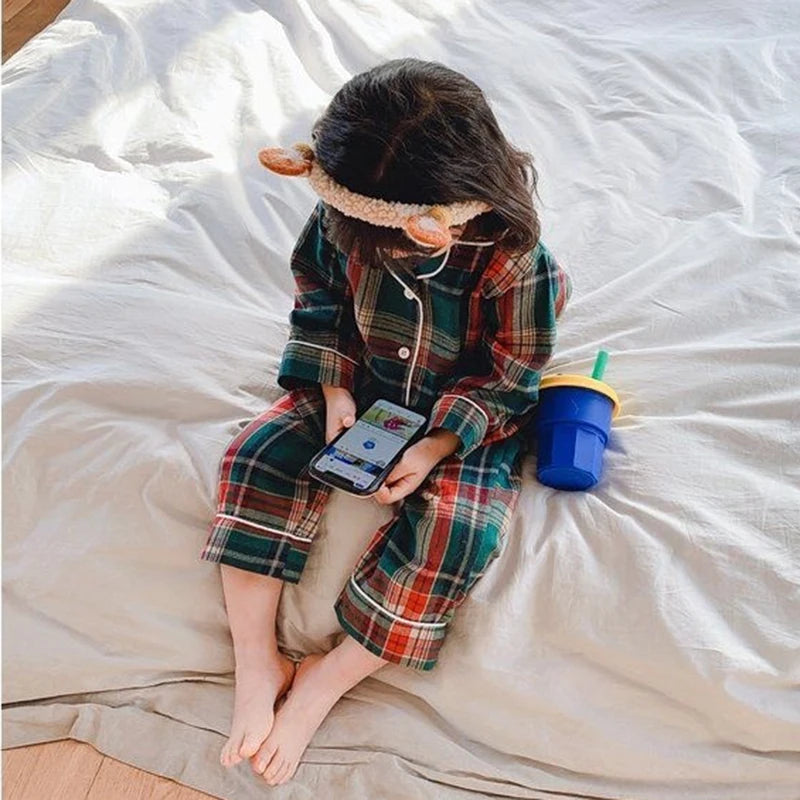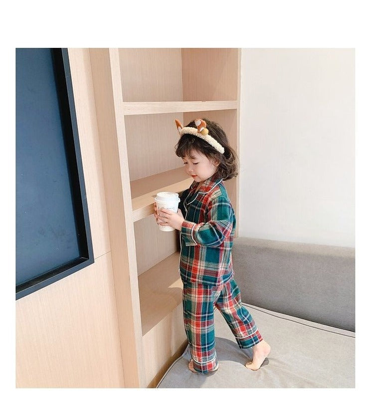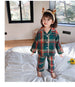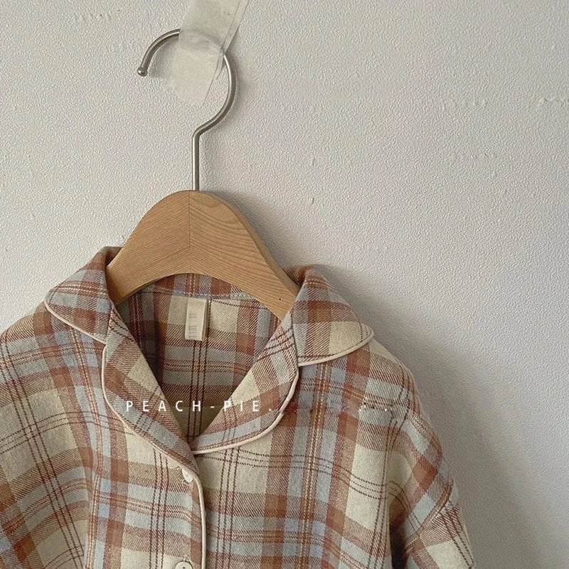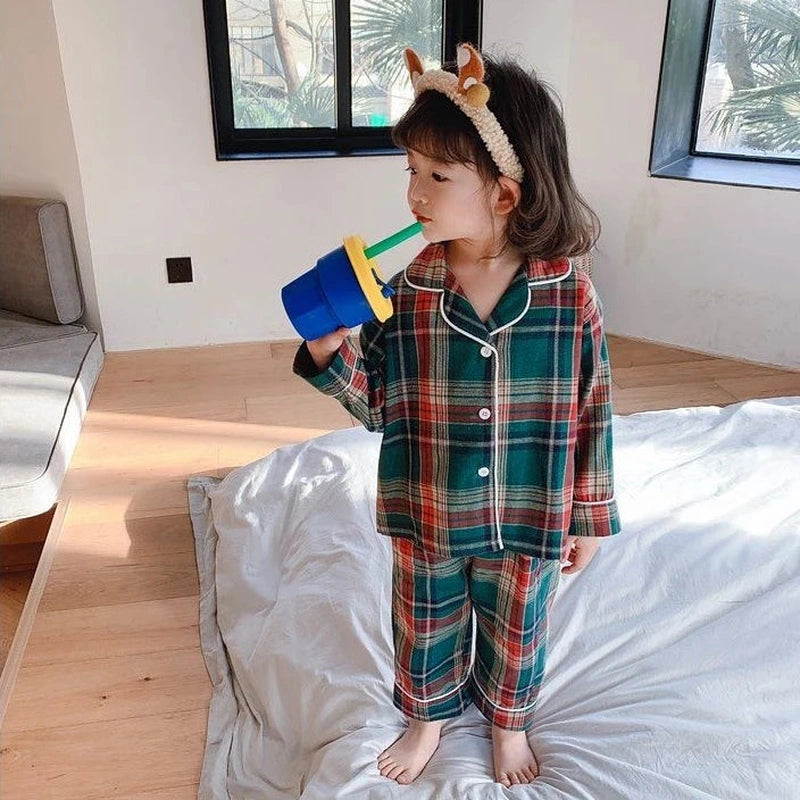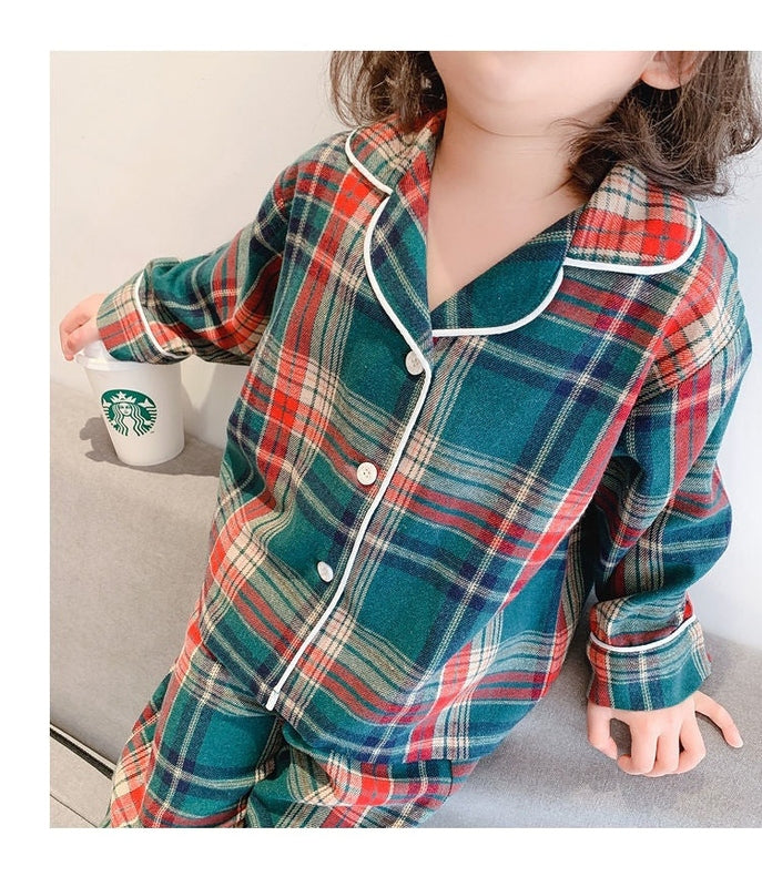 This charming pajama set features a turndown collar and contrast plaid design in two elegant color options: green and khaki. Perfect for toddlers and young kids, the set includes a button-down top and elastic-waist pants crafted from soft cotton for all-night comfort. Its timeless style and durable design make it a must-have for your child’s sleepwear collection.