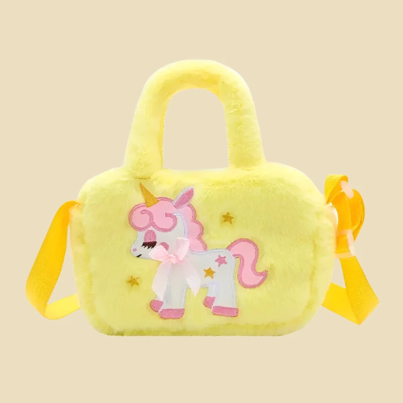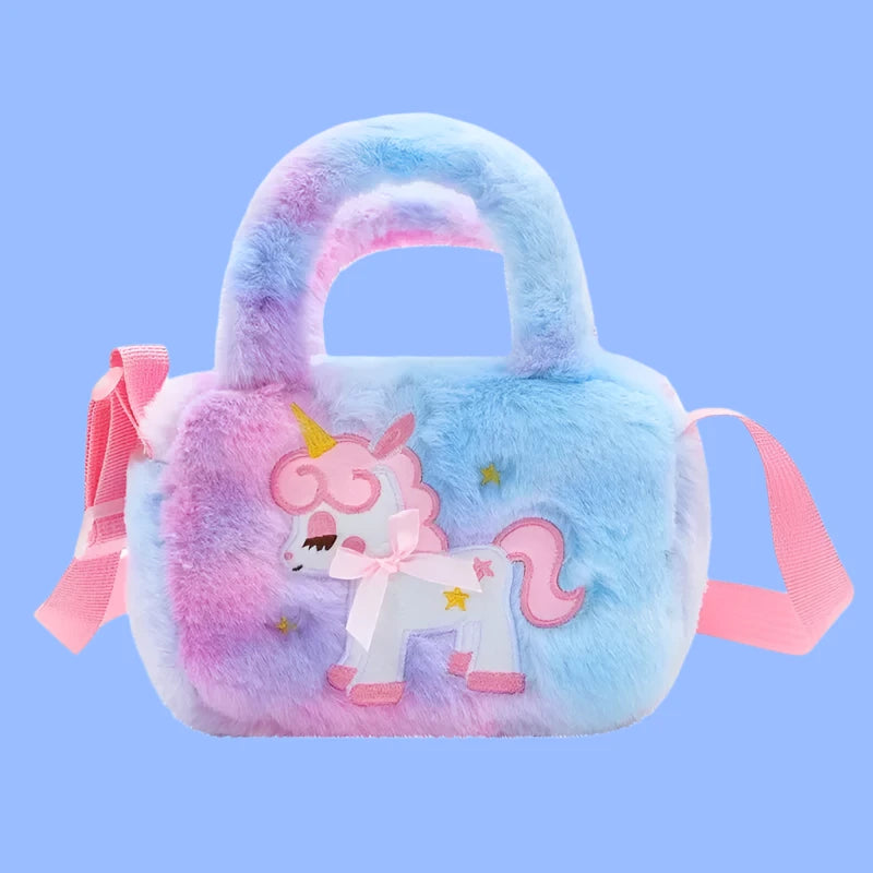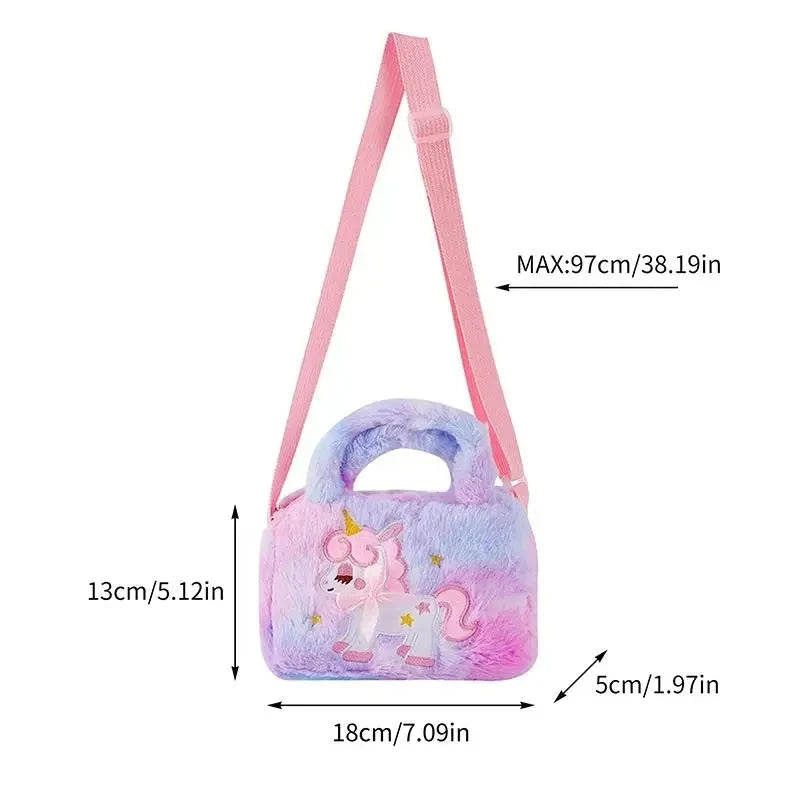 The rainbow-colored, fluffy purse features a beautifully embroidered unicorn design, giving it a whimsical charm that your child will love. Whether it's for a casual outing or a special gift, this purse adds a fun and playful touch to any outfit.