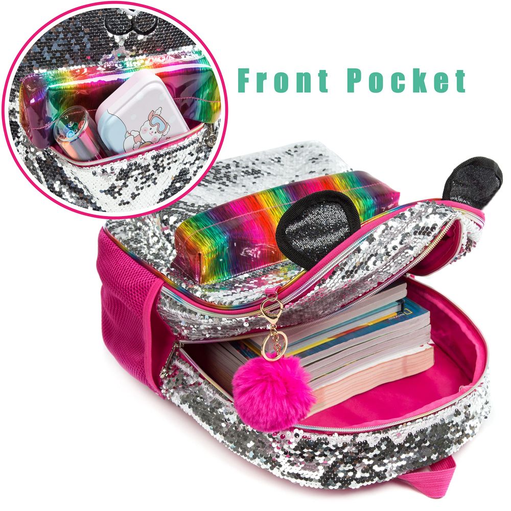 The standout feature of this mini backpack is its sparkling sequin design. Adorned with cute unicorn prints and a fluffy fur ball zipper, it’s perfect for any young girl who loves to shine. The playful design adds a fun touch to everyday activities and is sure to catch the attention of friends and teachers alike.