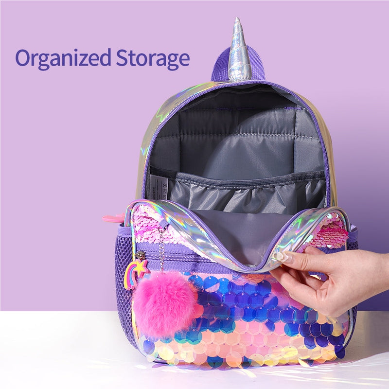 This playful and lightweight backpack is not just visually appealing—it’s also built to provide comfort and convenience for your child. From school supplies to snacks, this bag has ample space to store everything needed for a busy day. The reversible sequins add an interactive element, letting your child create her own fun designs or switch up the look depending on her mood.