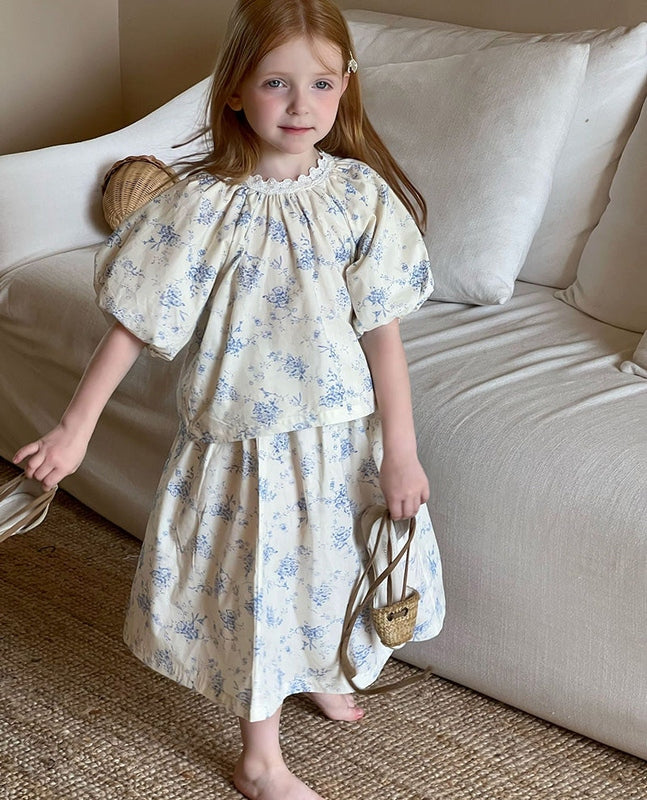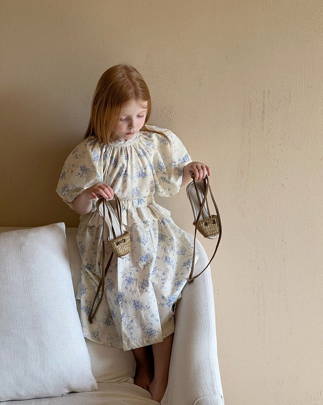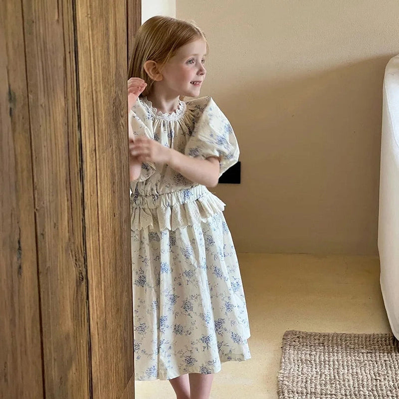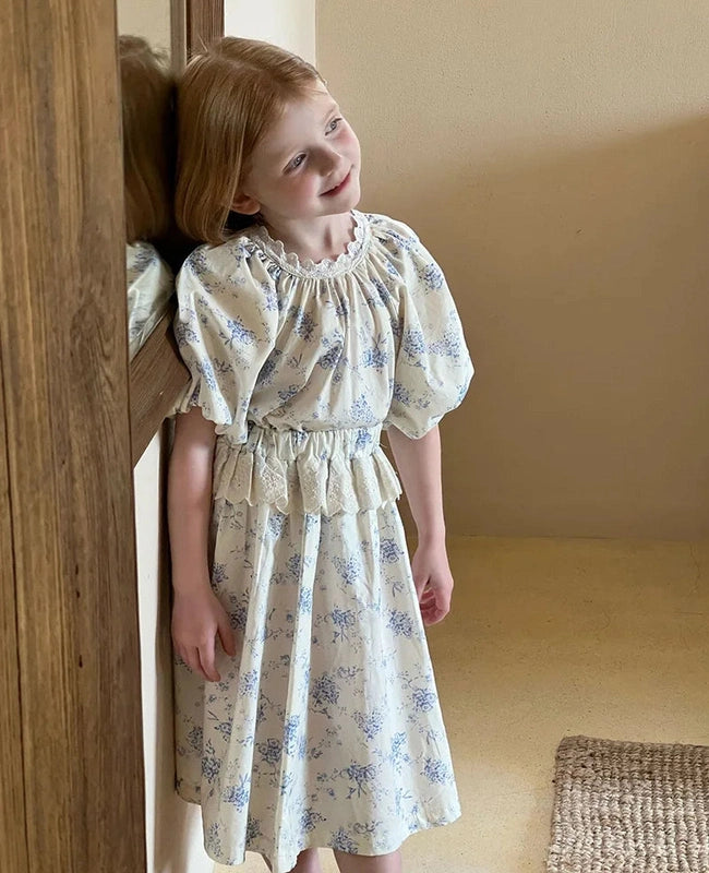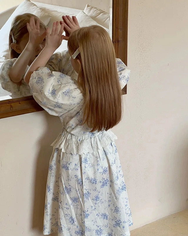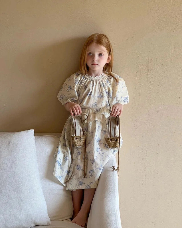 Featuring a stunning floral print in soft, calming hues of blue on a beige fabric, this dress set exudes vintage appeal. The timeless floral pattern is perfect for creating memorable moments, from birthdays to family gatherings. Its classic charm will have your little one looking like royalty, no matter the occasion.