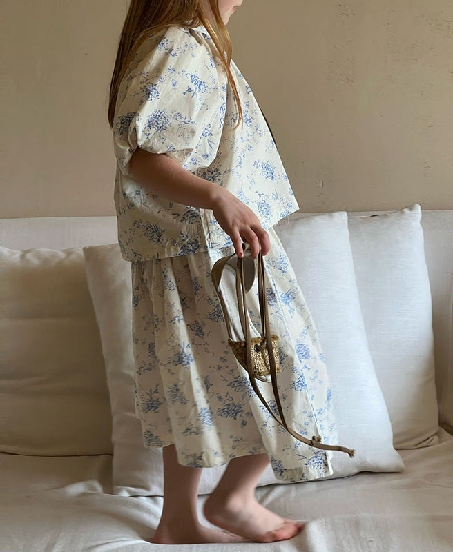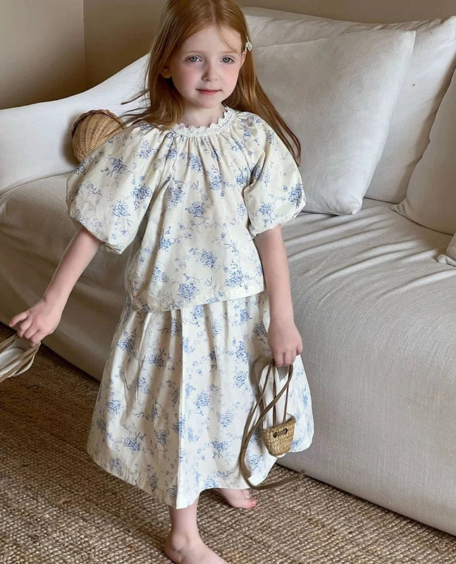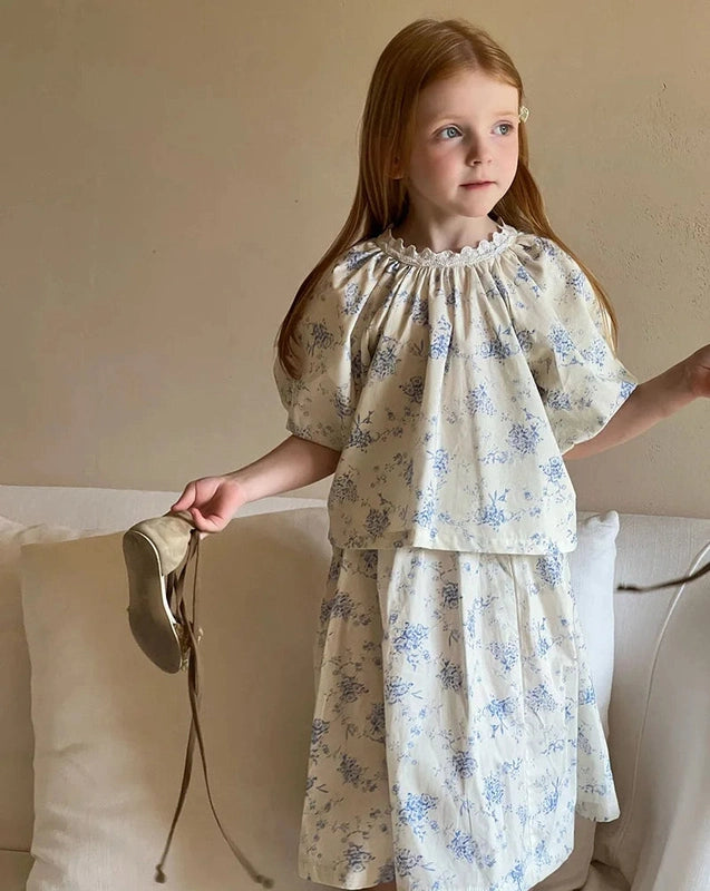 Dress your little girl in this beautiful, vintage-inspired floral dress set that radiates elegance and classic style. The delicate blue floral print combined with the Spanish-style blouse brings out a sophisticated charm while ensuring comfort for your baby. Ideal for family events, photoshoots, or simply a stylish day out.