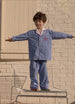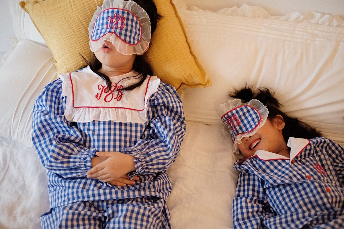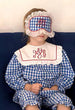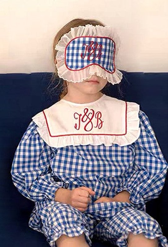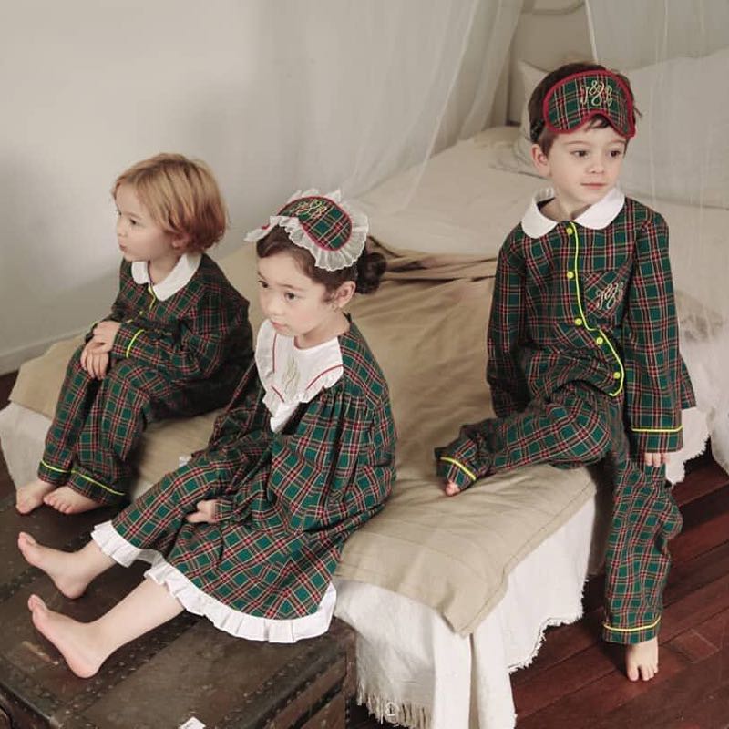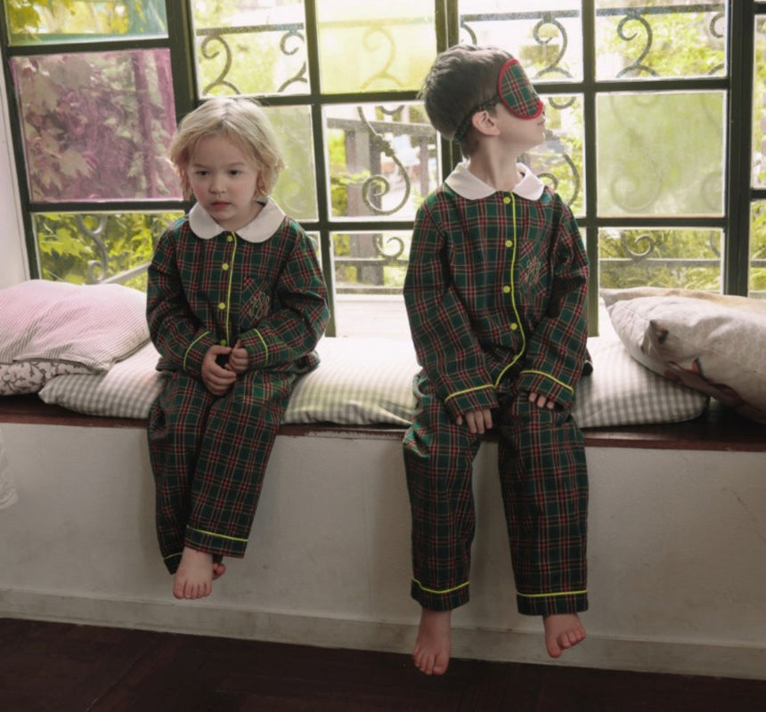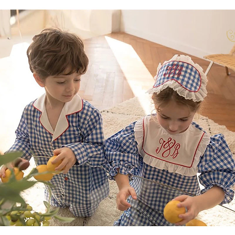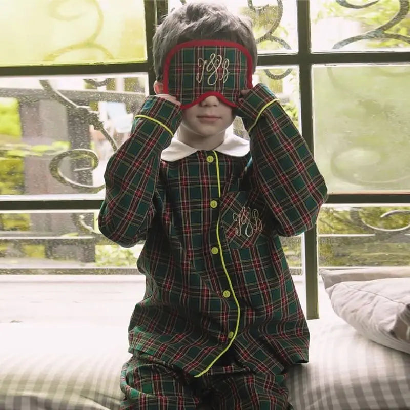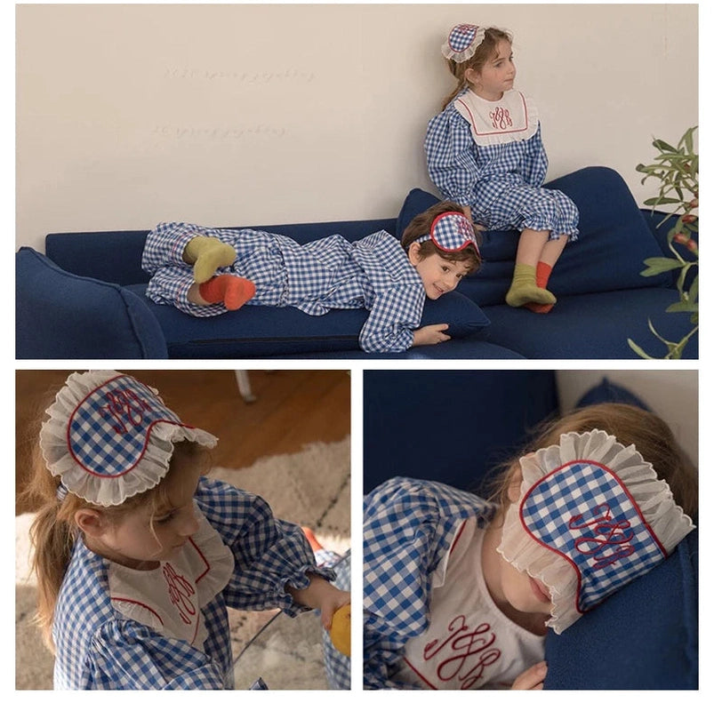 This vintage-inspired pajama set is perfect for toddlers and young children, offering both style and comfort. Featuring a classic plaid design, embroidered letters, and a matching blindfold, it’s ideal for bedtime, lounging, or pajama parties. Made from soft cotton and available in blue and green, this set is perfect for boys and girls alike.