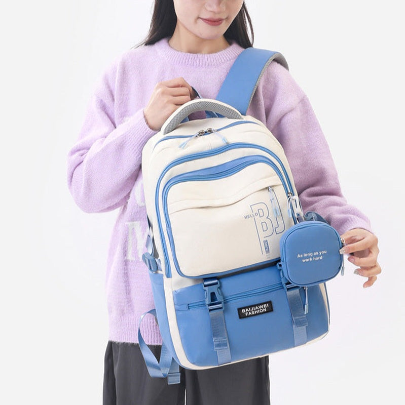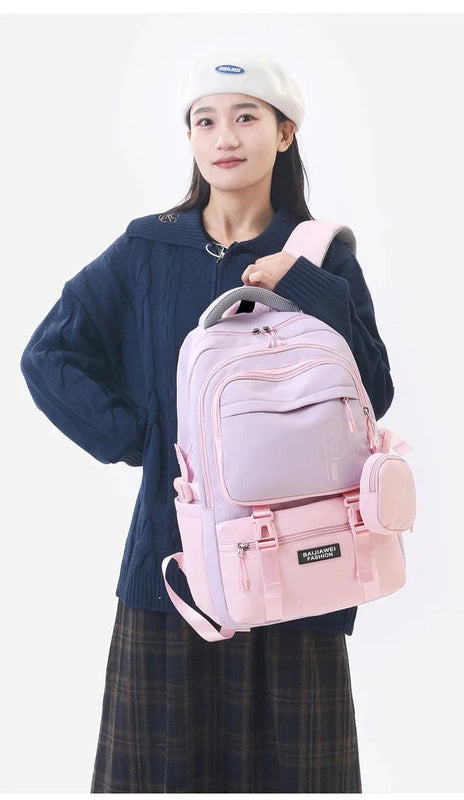 With multiple compartments and a roomy interior, this backpack offers plenty of space for books, stationery, and other school supplies. The additional purse adds extra convenience for smaller items, keeping everything neatly stored and easily accessible.